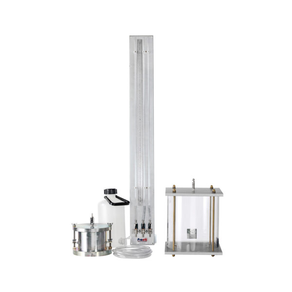 Consiste en una bancada metálica de 4 puestos diseñada para realizar ensayos de permeabilidad de carga constante y variable en muestras de suelo granular y compactado. Se suministra con depósito de agua regulable en altura entre 1350 y 3450 mm para los ensayos de carga constante, tubos, reglas graduadas, tuberías, conectores y grifos.